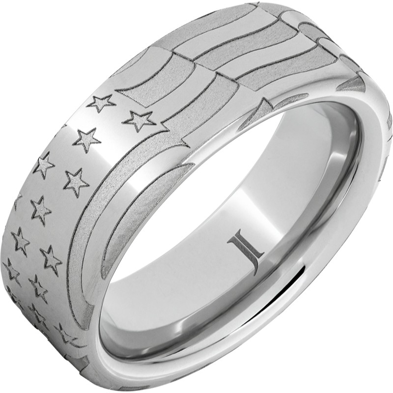 Proudly wear Old Glory on your finger! This Serinium® ring is laser engraved with the stars and stripes of the American flag. Also available in Black Diamond Ceramic (RMCA006976) and Rugged Tungsten. See our complete collection of American flag rings by searching on our website. 8mm width, inside rounded Comfort Fit for wearability.